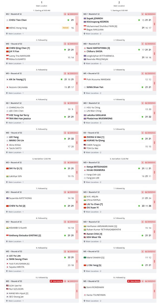 亚锦赛首日全部为资格赛,并无国羽选手出战。第二日比赛为4个场地同时进行,每个场地都是上午9点开始。日场比赛基本为前10场,晚场为剩余比赛。